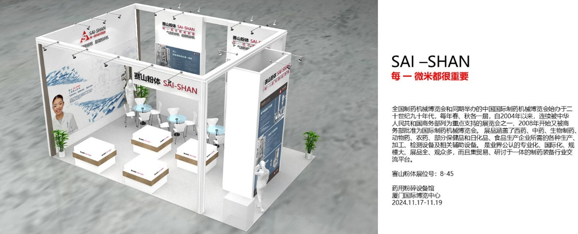第65屆(2024年秋季)全國制藥機械博覽會暨2024(秋季)中國國際制藥機械博覽會將于11月17-19號在美麗的廈門舉辦。屆時海內外1500多家制藥裝備生產及服務企業與數萬醫藥行業同仁將再度相聚青廈門國際博覽中心,共襄行業發展盛舉! 賽山粉體展位號 :8-45展位